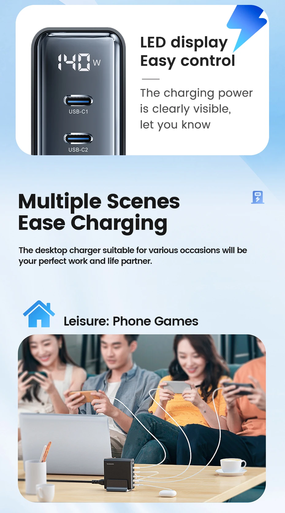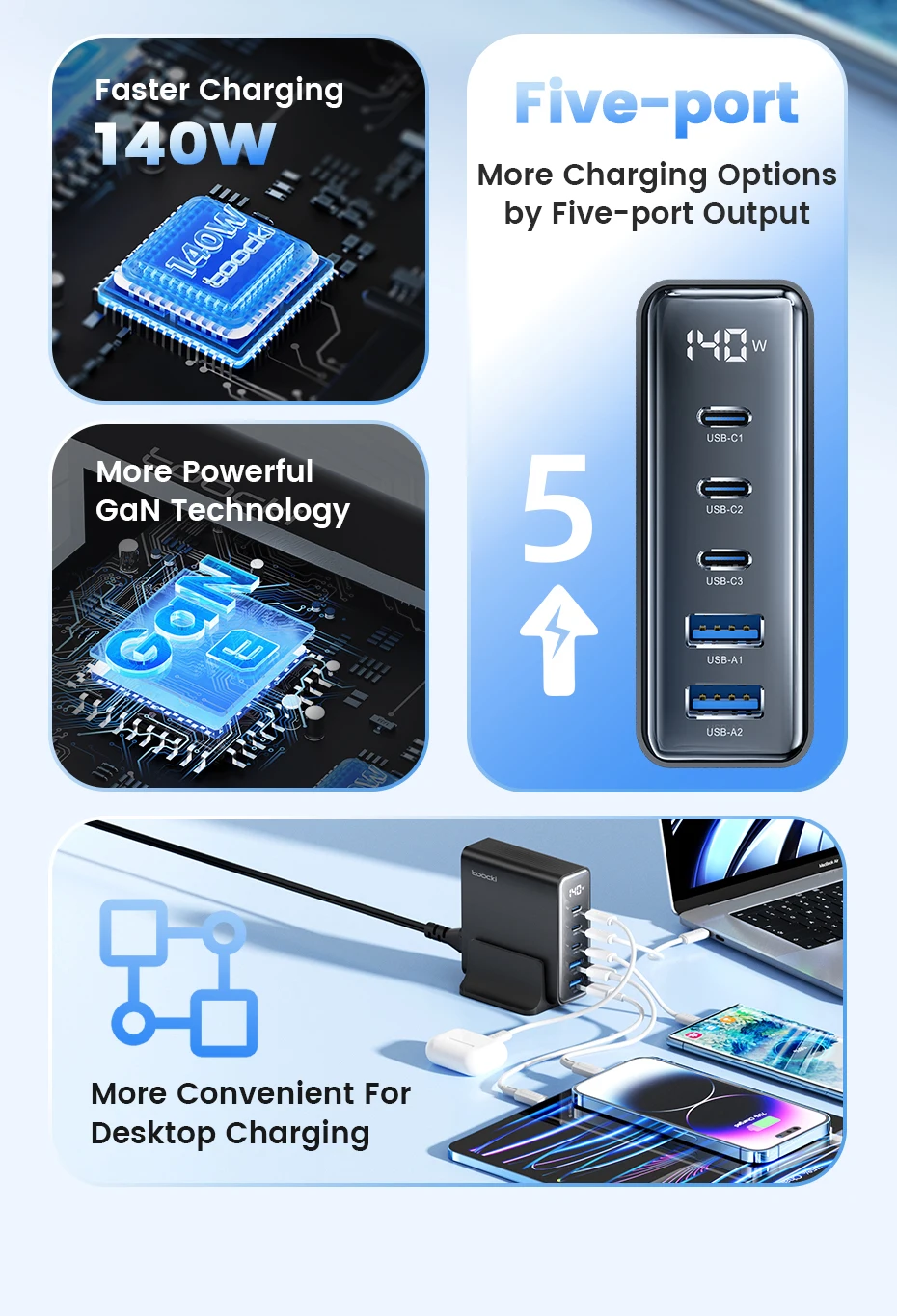 – Advanced 140W total output ensures rapid charging for multiple devices at once