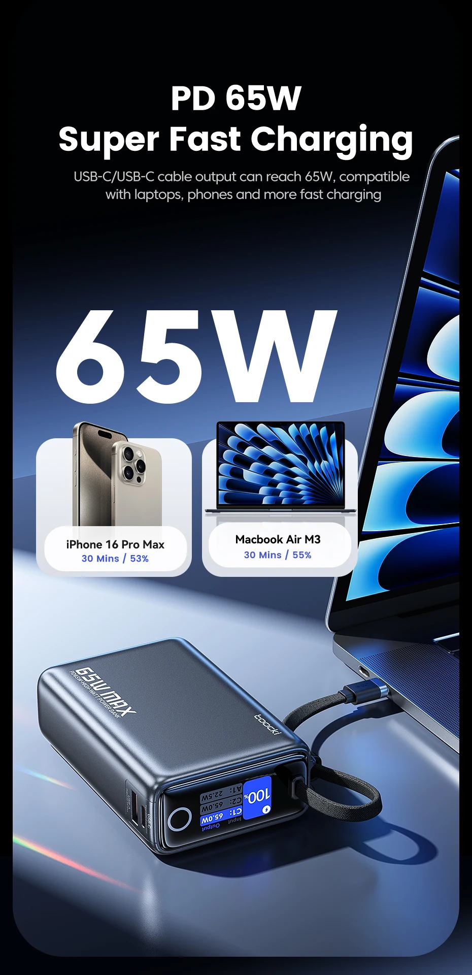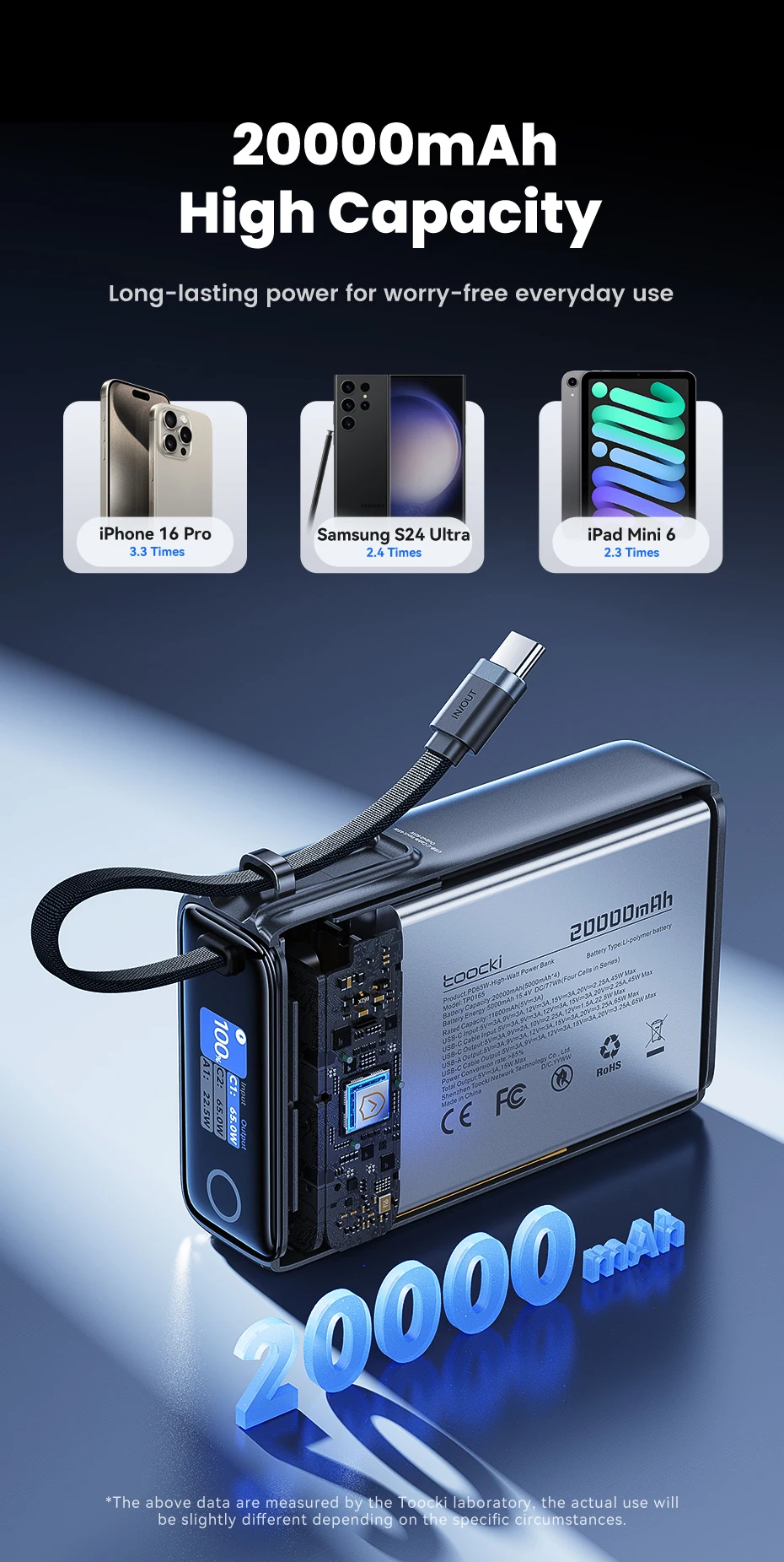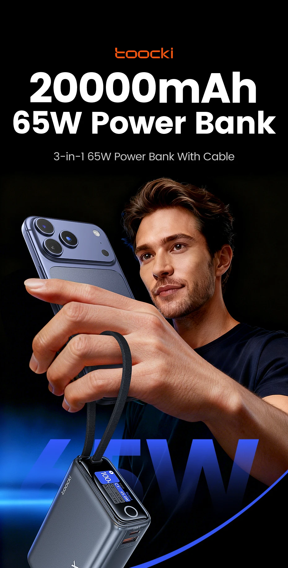 Experience uninterrupted productivity and connectivity with the Toocki Portable Powerbank, a high-capacity 65W 20000mAh external battery designed to fast-charge your laptop, iPhone 17, iPhone 16, and other compatible devices. Engineered with the latest PD3.0 technology and a digital visualized display, this powerbank ensures you always know your remaining power and can recharge quickly and efficiently wherever you are.