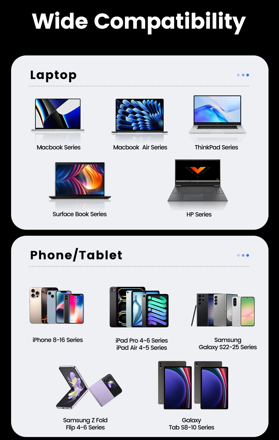 – Universal compatibility with laptops, iPhone 17, iPhone 16, and various USB-powered devices.