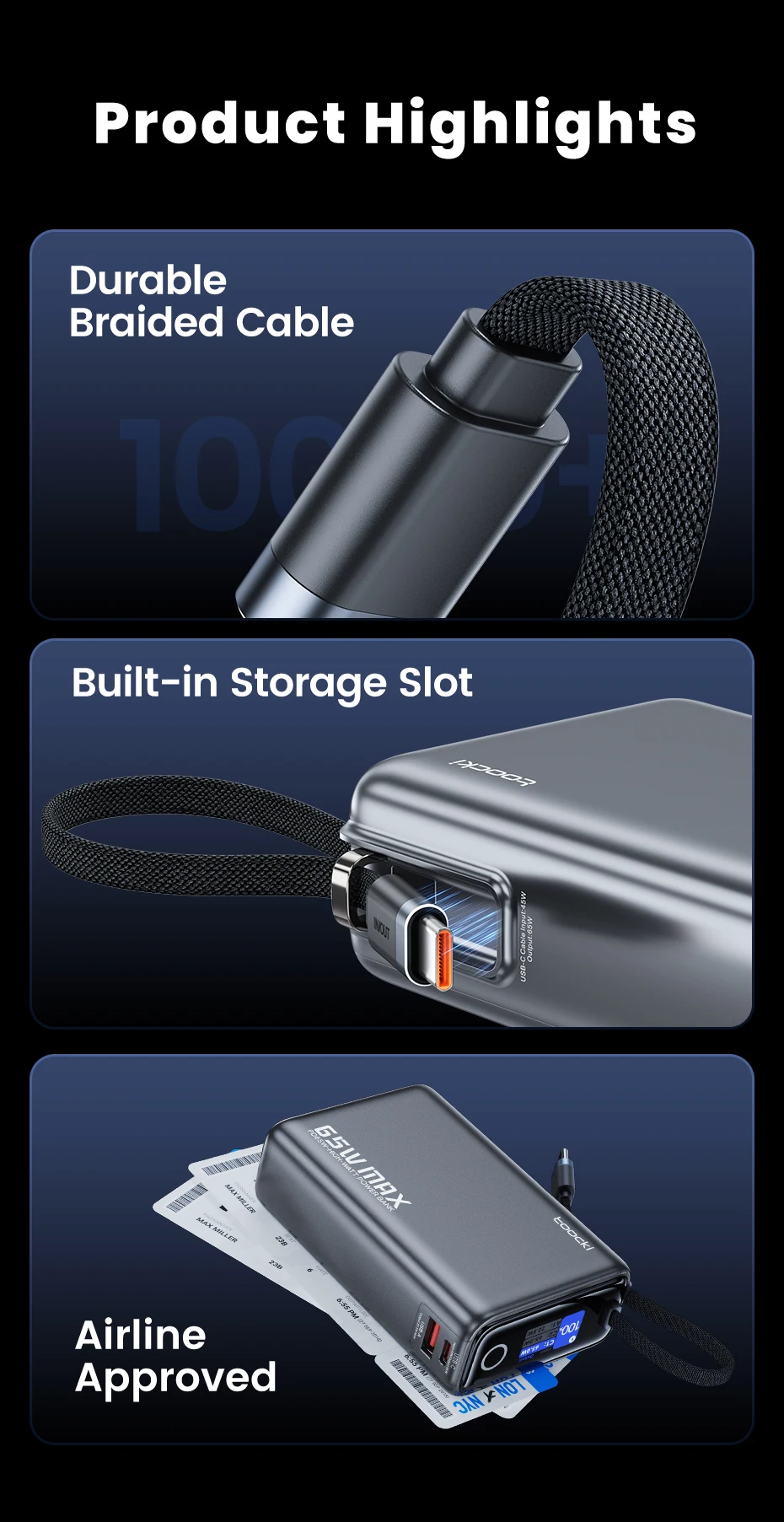 – High-speed 65W power delivery (PD3.0) supports rapid charging for compatible devices, reducing downtime.