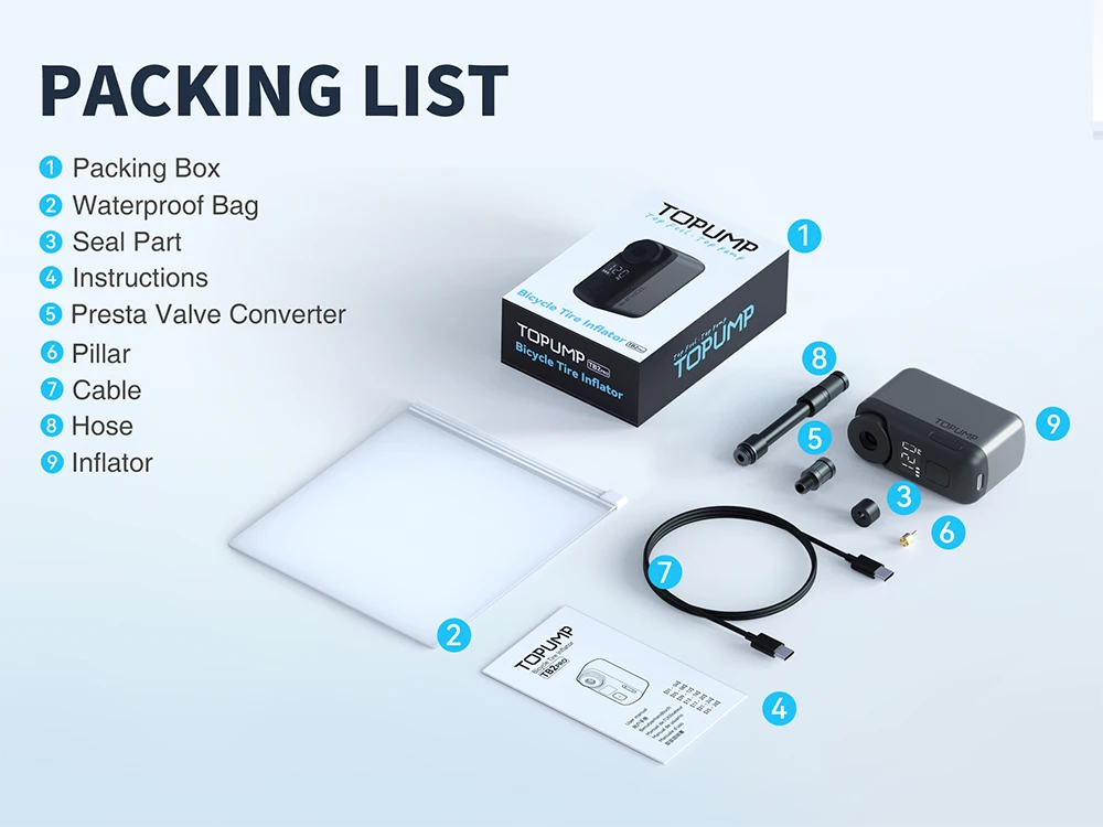 Constructed from durable materials to withstand regular outdoor use, the TOPUMP TB2 PRO requires minimal maintenance—simply keep it charged and clean after use. Its sleek design offers both functionality and aesthetic appeal. Ideal for sports and recreational use, this pump is a reliable companion for all cycling adventures.