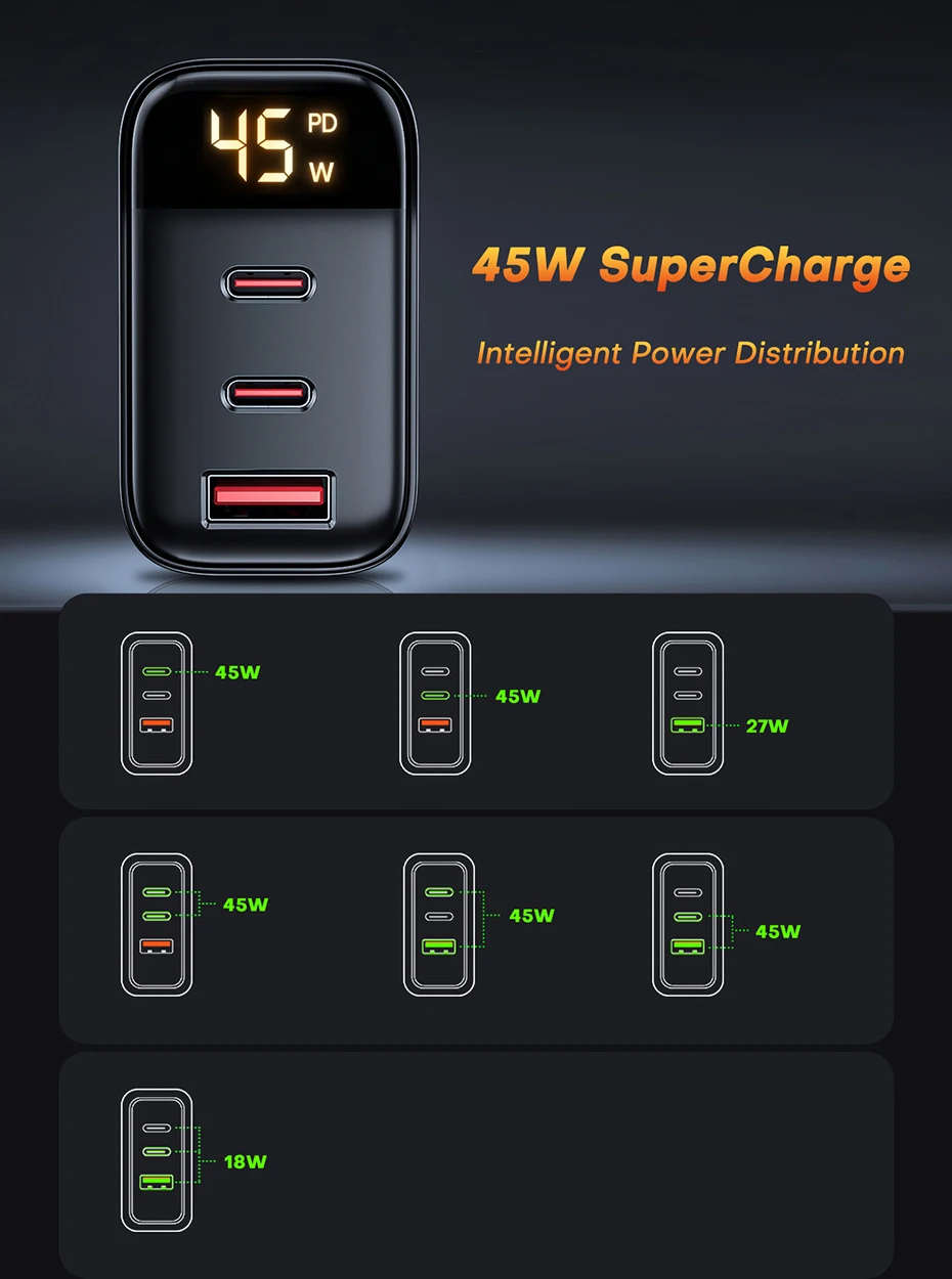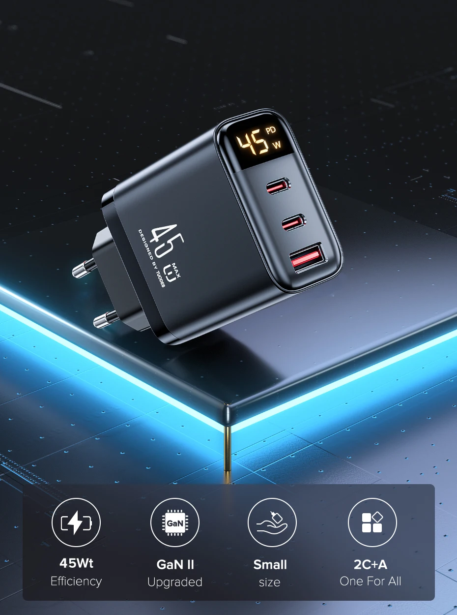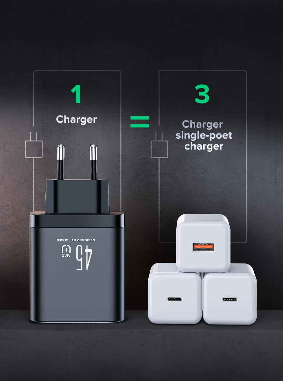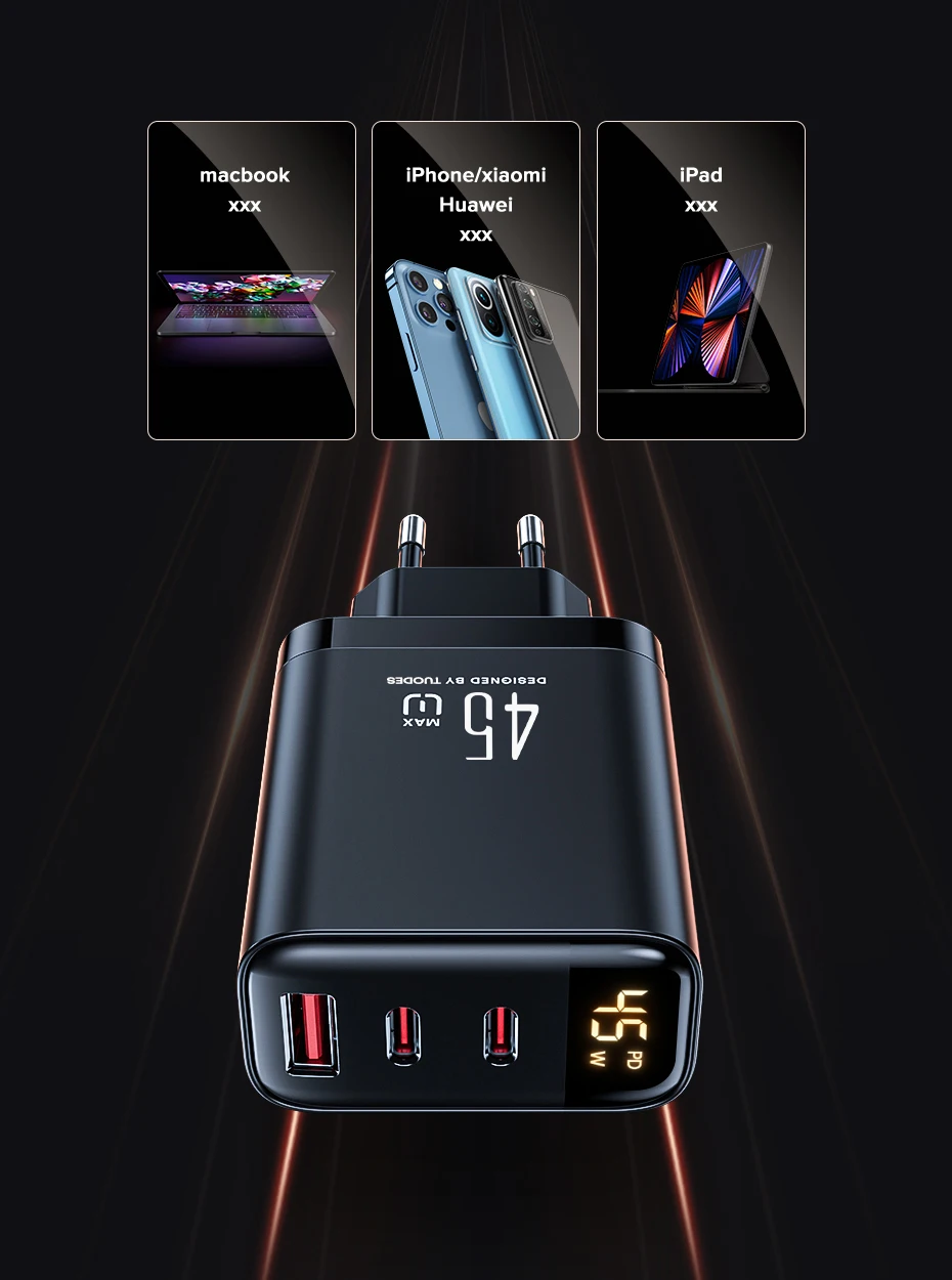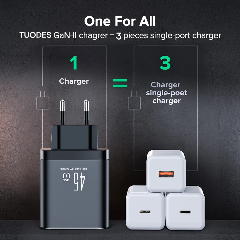 Experience the next level of fast charging technology with the Tuodes 45W GaN Charger—powerful, portable, and perfectly suited for your modern digital lifestyle.