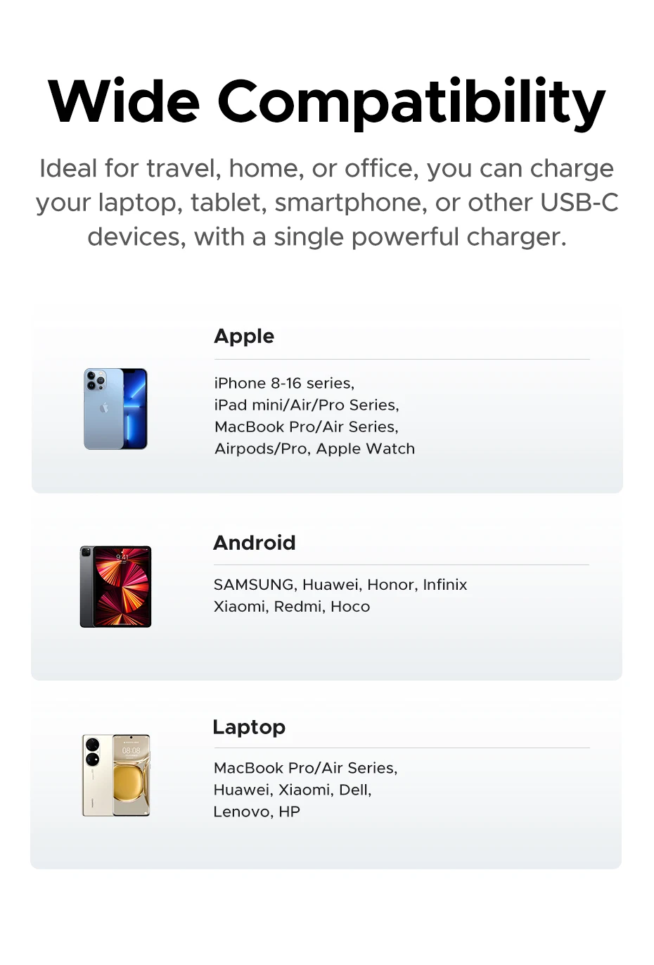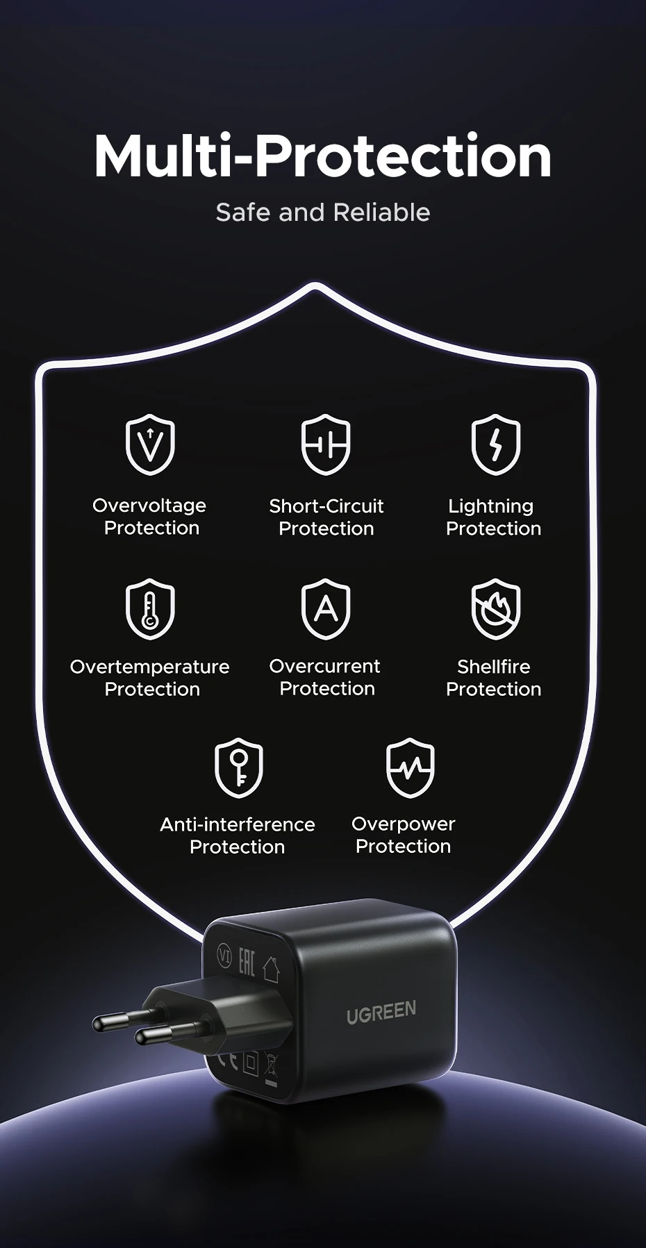 Experience rapid and reliable charging with the UGREEN 45W GaN Charger, designed to deliver high-speed power to your Samsung S25, S24 Ultra, iPhone 17, 16, 15 Pro Max, iPad, and other tablets. Utilizing advanced GaN technology and multiple fast charging protocols, this compact charger ensures your devices are powered up quickly and safely, whether at home, in the office, or on the go.