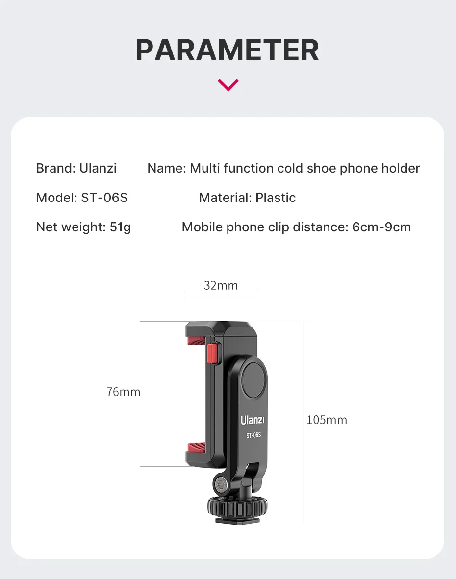 Constructed from high-quality materials, the Ulanzi ST-06 S combines strength and durability with a lightweight form factor. The clamp mechanism is designed to prevent scratches and securely hold your phone in place even during movement. For maintenance, simply wipe clean with a soft, dry cloth to keep it looking and functioning like new. This phone holder is an essential accessory for anyone seeking to upgrade their mobile filming setup with precision and convenience.