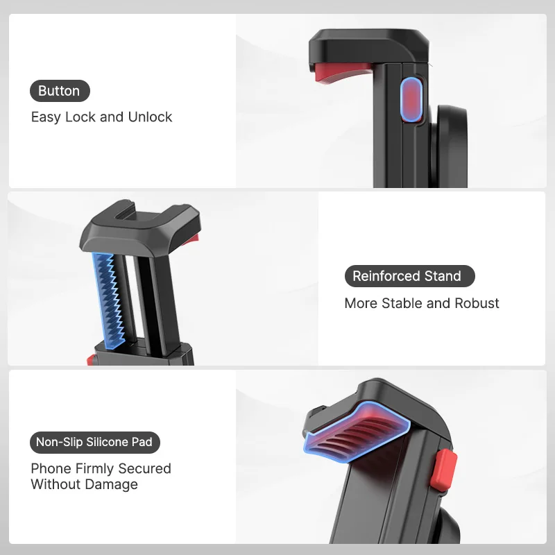 – Sturdy phone clamp compatible with a wide range of smartphones, ensuring a secure grip without damage