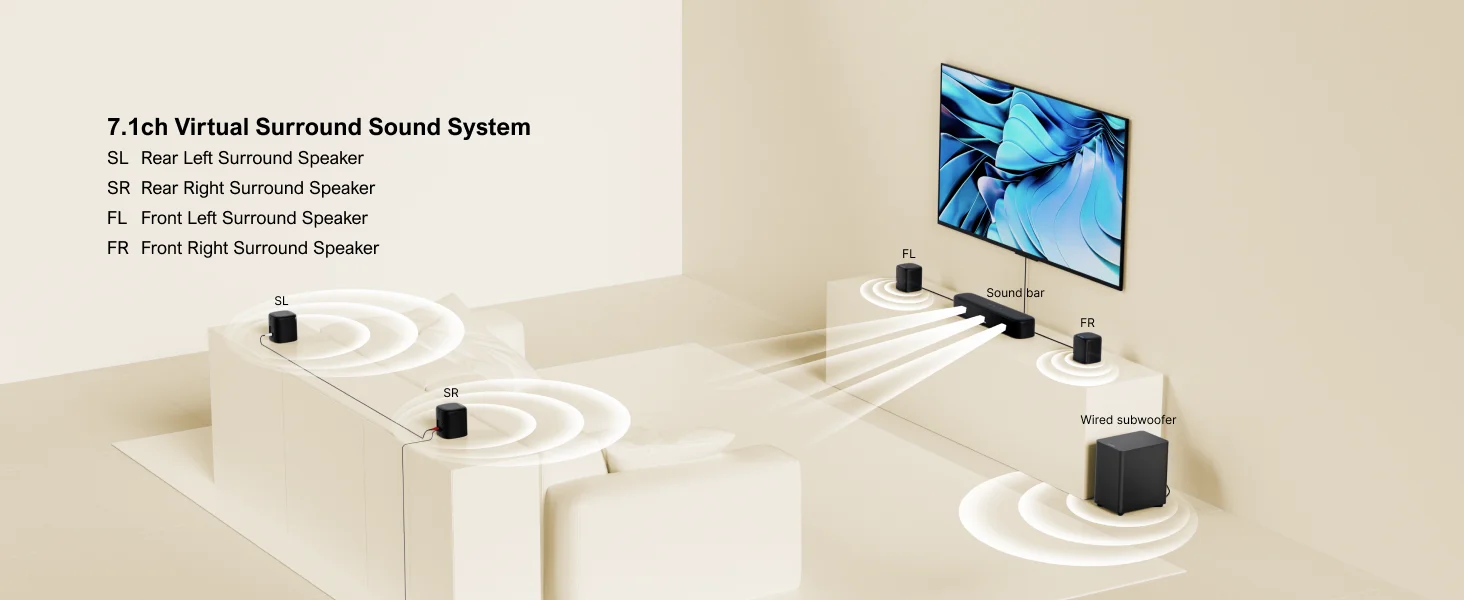 – 7.1 channel virtual surround sound technology for a cinema-quality audio experience without multiple speakers