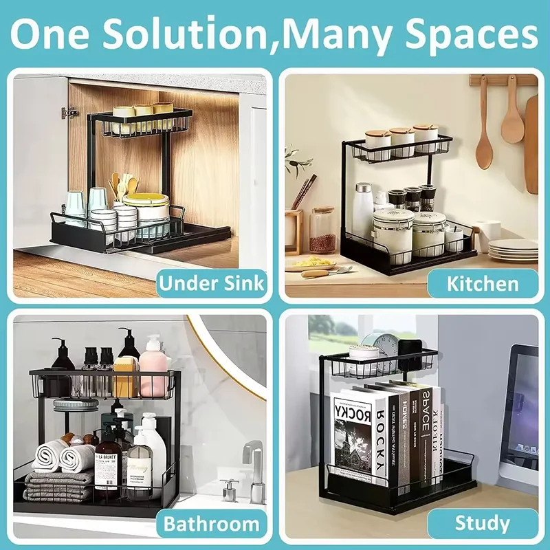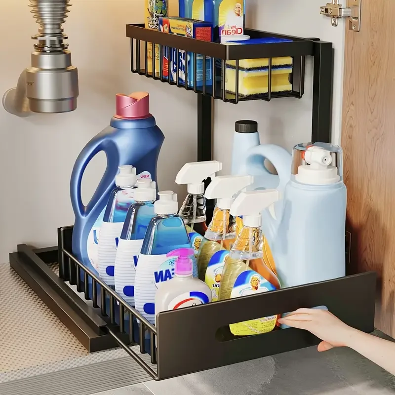 Imagine the convenience of having all your under-sink essentials perfectly organized. In the kitchen, store dish soap, sponges, cleaning sprays, and extra paper towels. In the bathroom, keep toiletries, hair products, and cleaning supplies neatly arranged. This organizer is not just about storage; it's about enhancing your daily routine by saving you time and frustration. Its sturdy build is designed to withstand the rigors of everyday use, making it a reliable addition to your home.