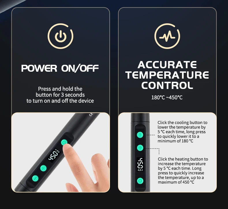 – Adjustable Temperature Control: Precisely set your desired soldering temperature for various materials and applications.