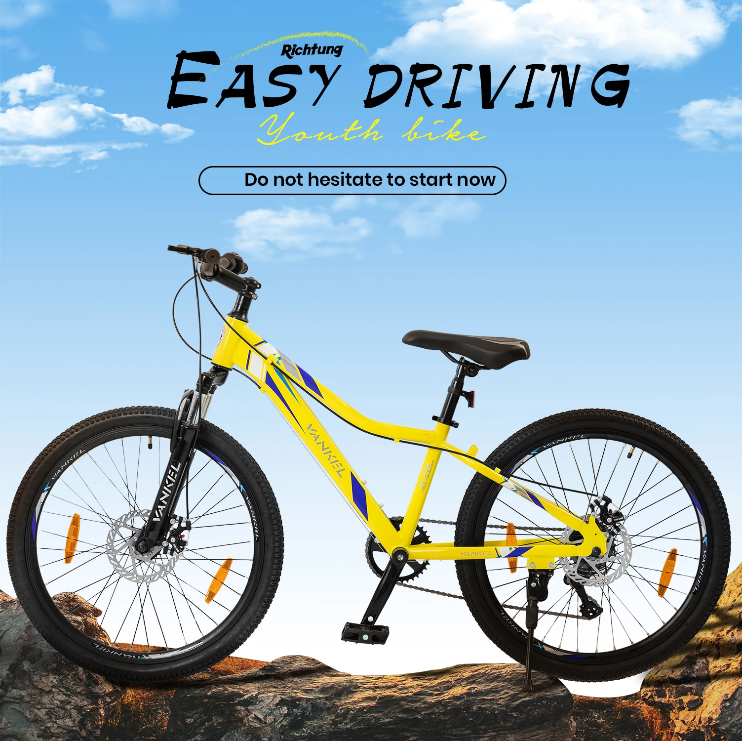 The Vankel 24-Inch Kids Mountain Bike is expertly designed to provide boys and girls with a safe, reliable, and exciting cycling experience. Whether exploring trails or cruising through the neighborhood, this vibrant yellow MTB combines durability with performance, making it an ideal choice for active teenagers ready to take their riding skills to the next level.