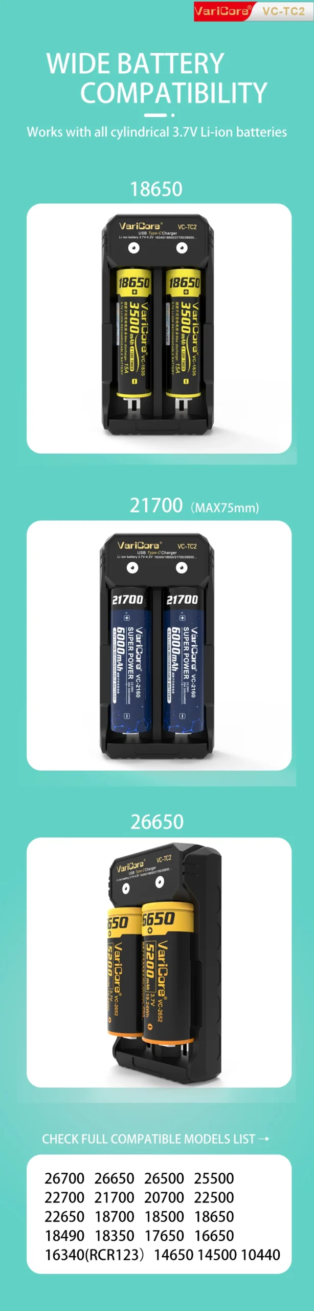 Experience the convenience and efficiency of the Vari Core TC2 Q4 Type-C Smart Charger, expertly designed to independently charge a variety of popular rechargeable batteries including 18650, 21700, 26650, and 18350 Li-ion as well as Ni-MH battery types. This advanced charger utilizes intelligent circuitry to deliver fast, safe, and optimized charging tailored to each battery’s specific needs, ensuring longevity and peak performance.
