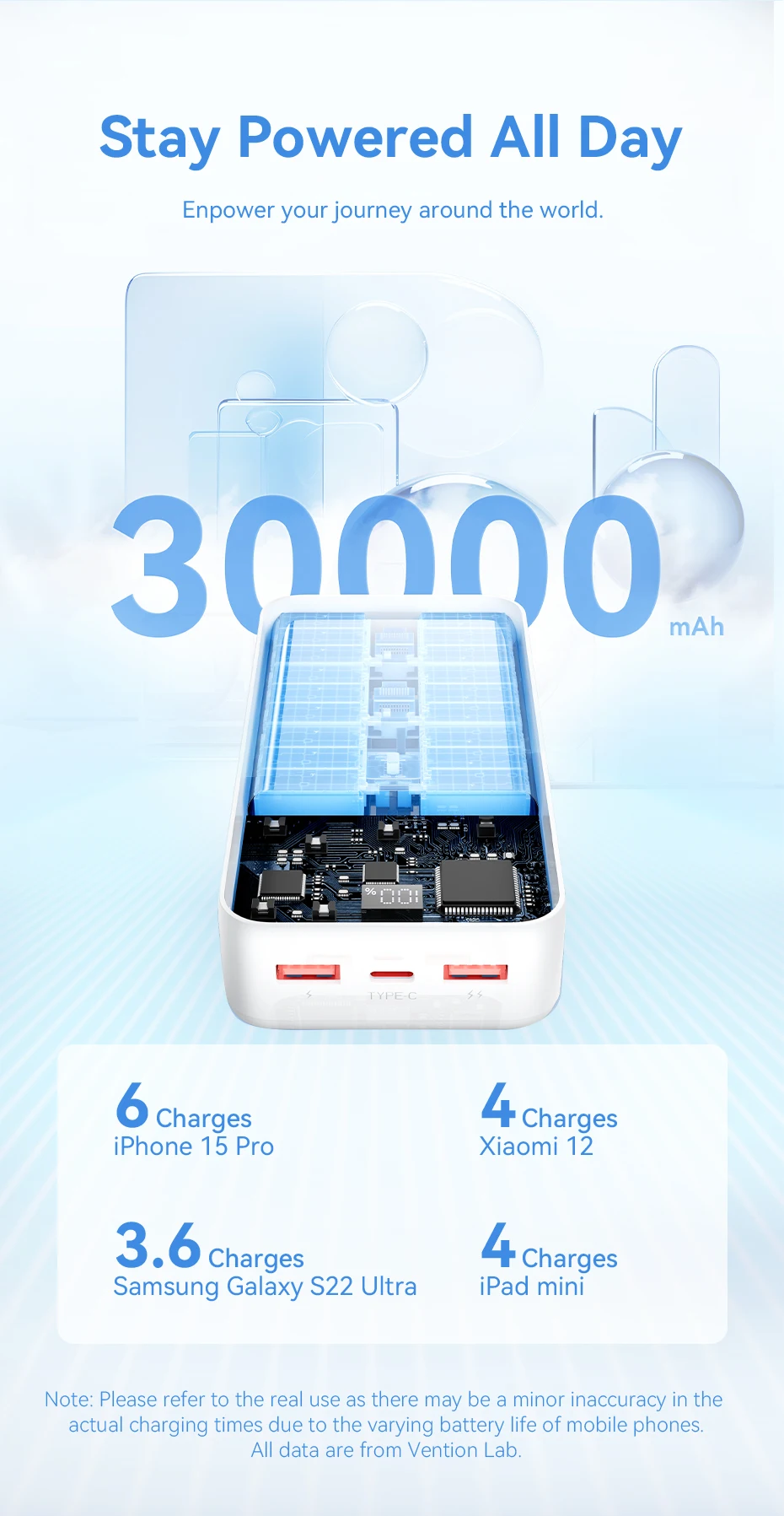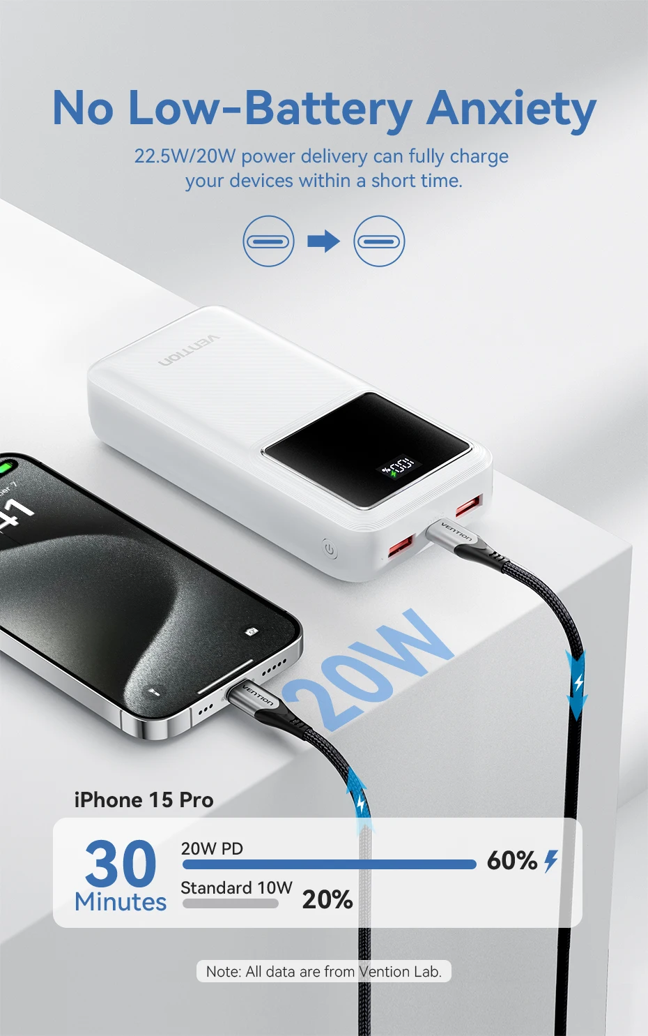 Vention 30000 mAh Power Bank USB Type C PD Fast Charge 22.5W Portable External Battery Charger