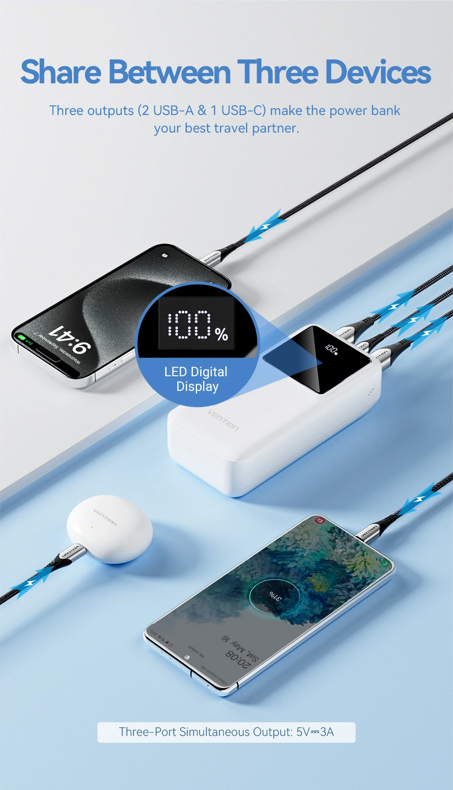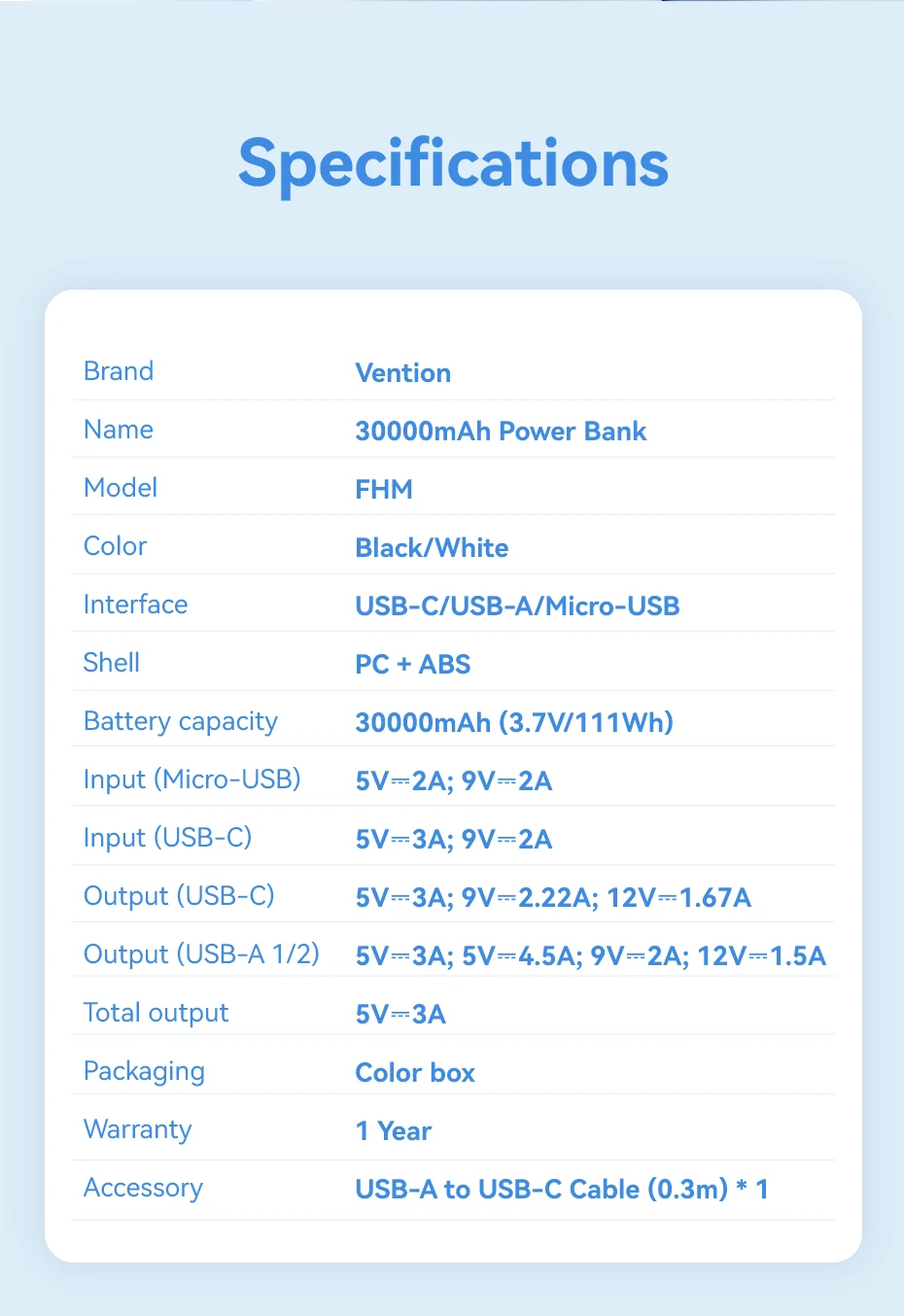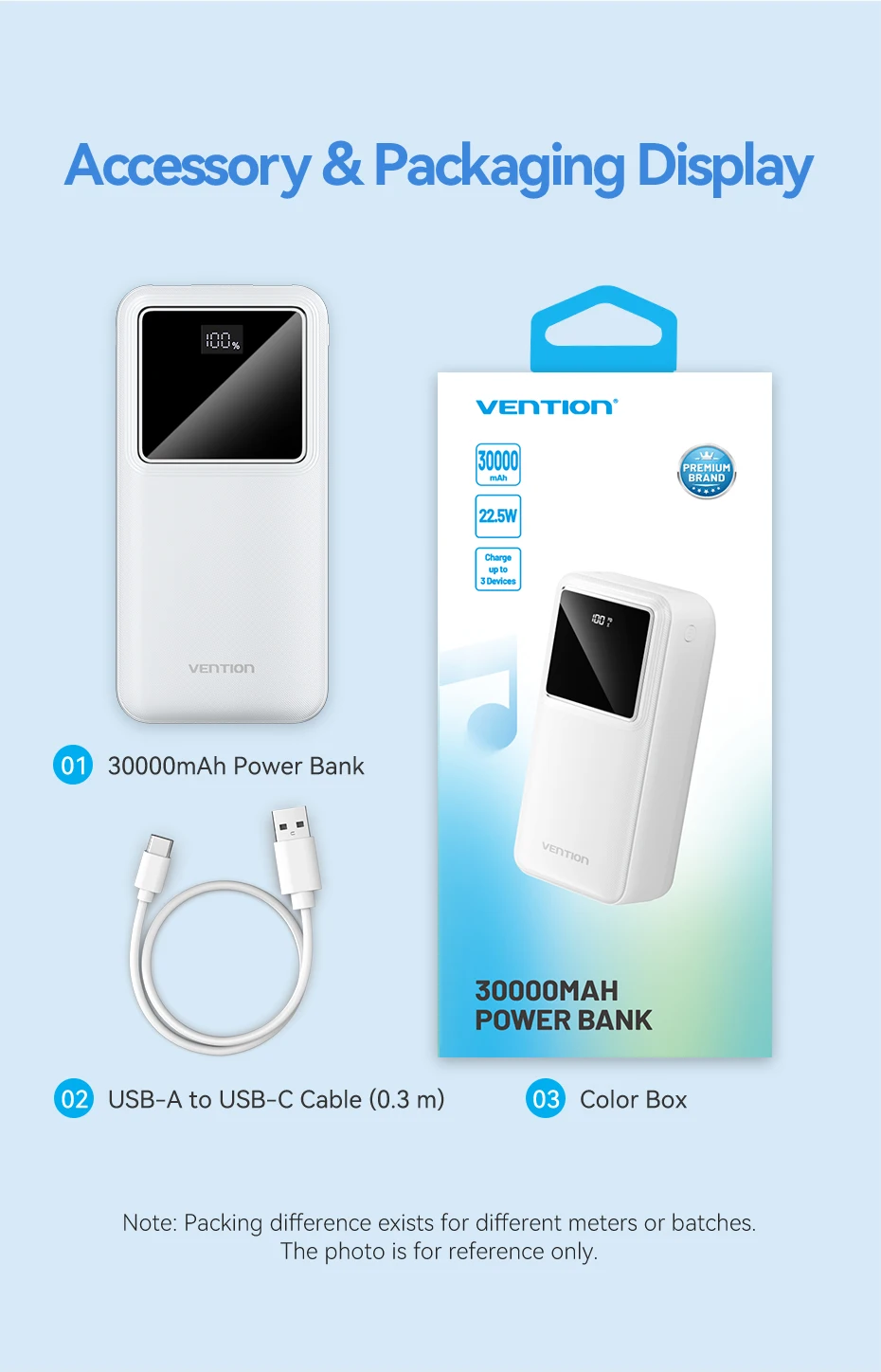 Constructed with high-quality materials, the power bank is durable and designed for long-term use. To maintain optimal performance, avoid exposing the device to extreme temperatures and keep it away from moisture. Regularly charging the power bank every few months when not in use will help preserve battery health. Perfect for tech enthusiasts and professionals who require a reliable and powerful charging solution, the Vention 30000 mAh Power Bank combines functionality with sleek design.