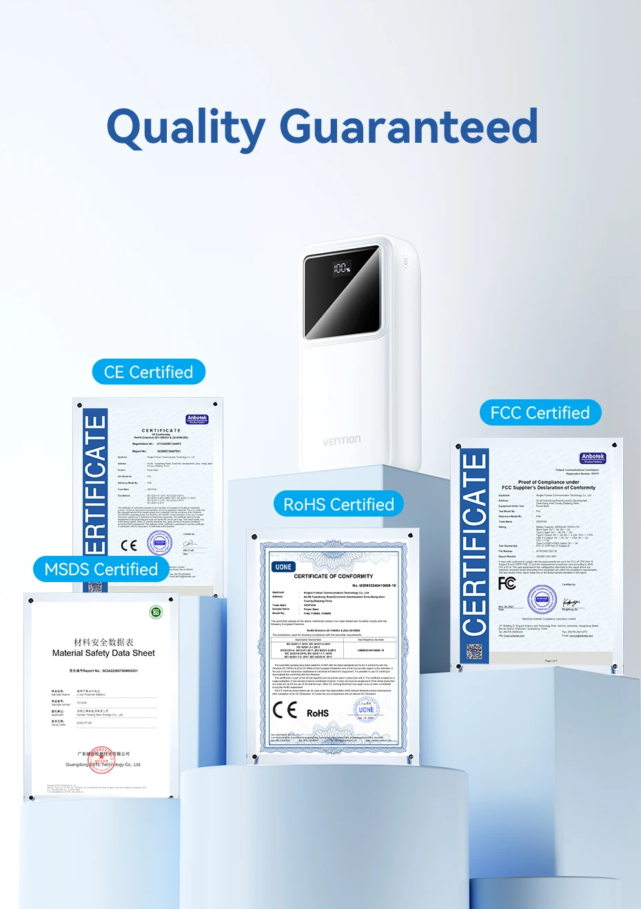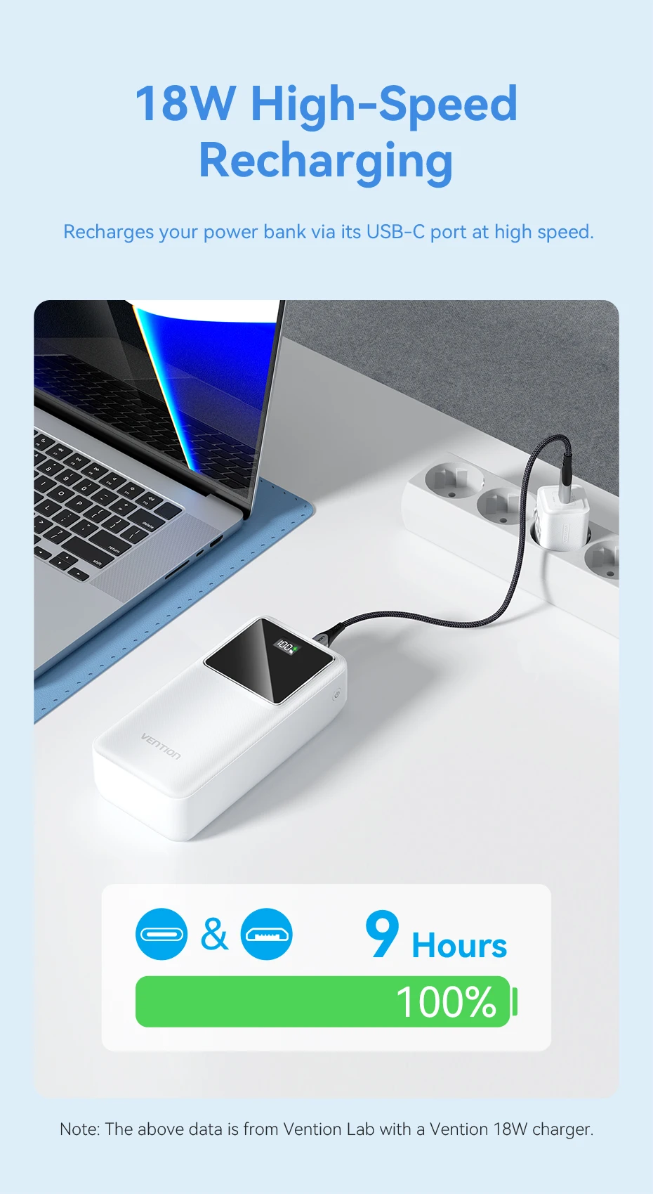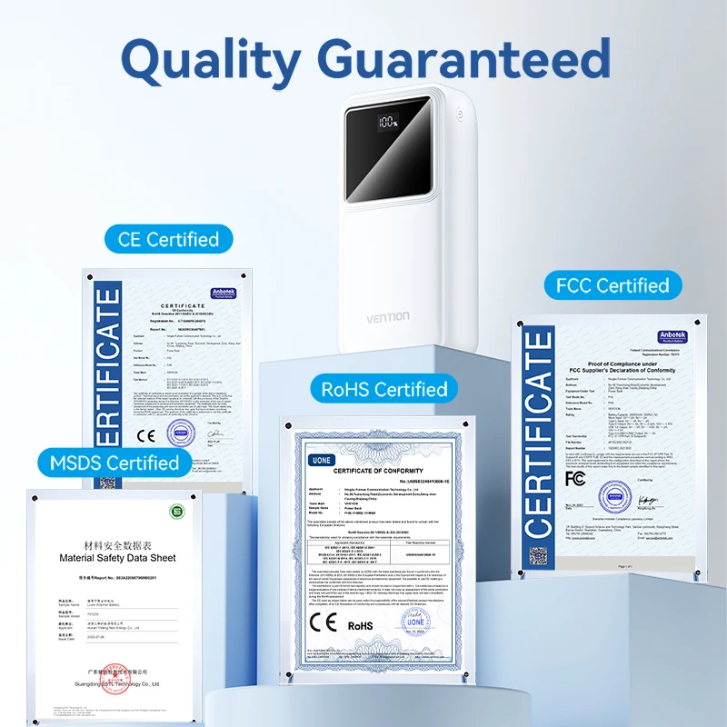 Constructed with high-quality materials, the power bank is durable and designed for long-term use. To maintain optimal performance, avoid exposing the device to extreme temperatures and keep it away from moisture. Regularly charging the power bank every few months when not in use will help preserve battery health. Perfect for tech enthusiasts and professionals who require a reliable and powerful charging solution, the Vention 30000 mAh Power Bank combines functionality with sleek design.