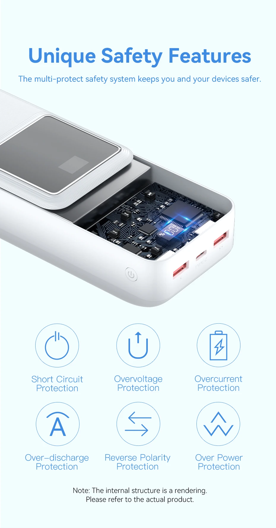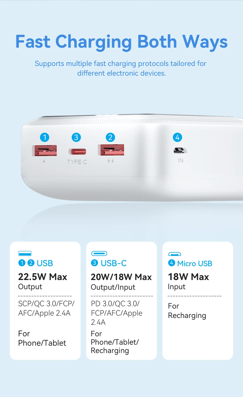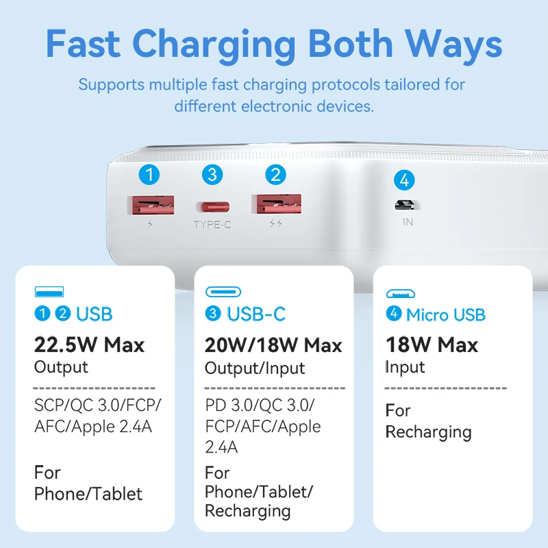 – USB Type-C Power Delivery (PD) technology supports fast charging at up to 22.5W for quick, efficient energy transfer