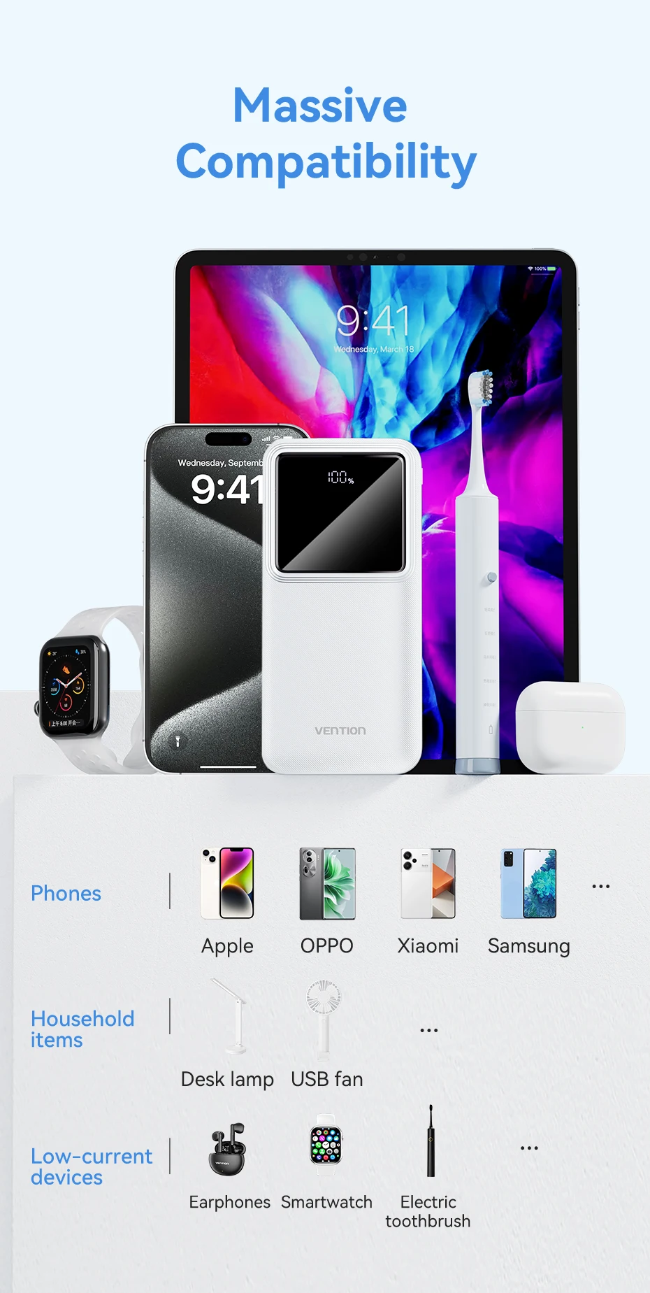 Stay powered up wherever you go with the Vention 30000 mAh Power Bank. Designed for professionals and everyday users alike, this portable external battery charger delivers fast, efficient charging for a variety of devices including MacBook laptops, tablets, and iPhones. Its sleek design and robust capacity ensure you never run out of power during critical moments.