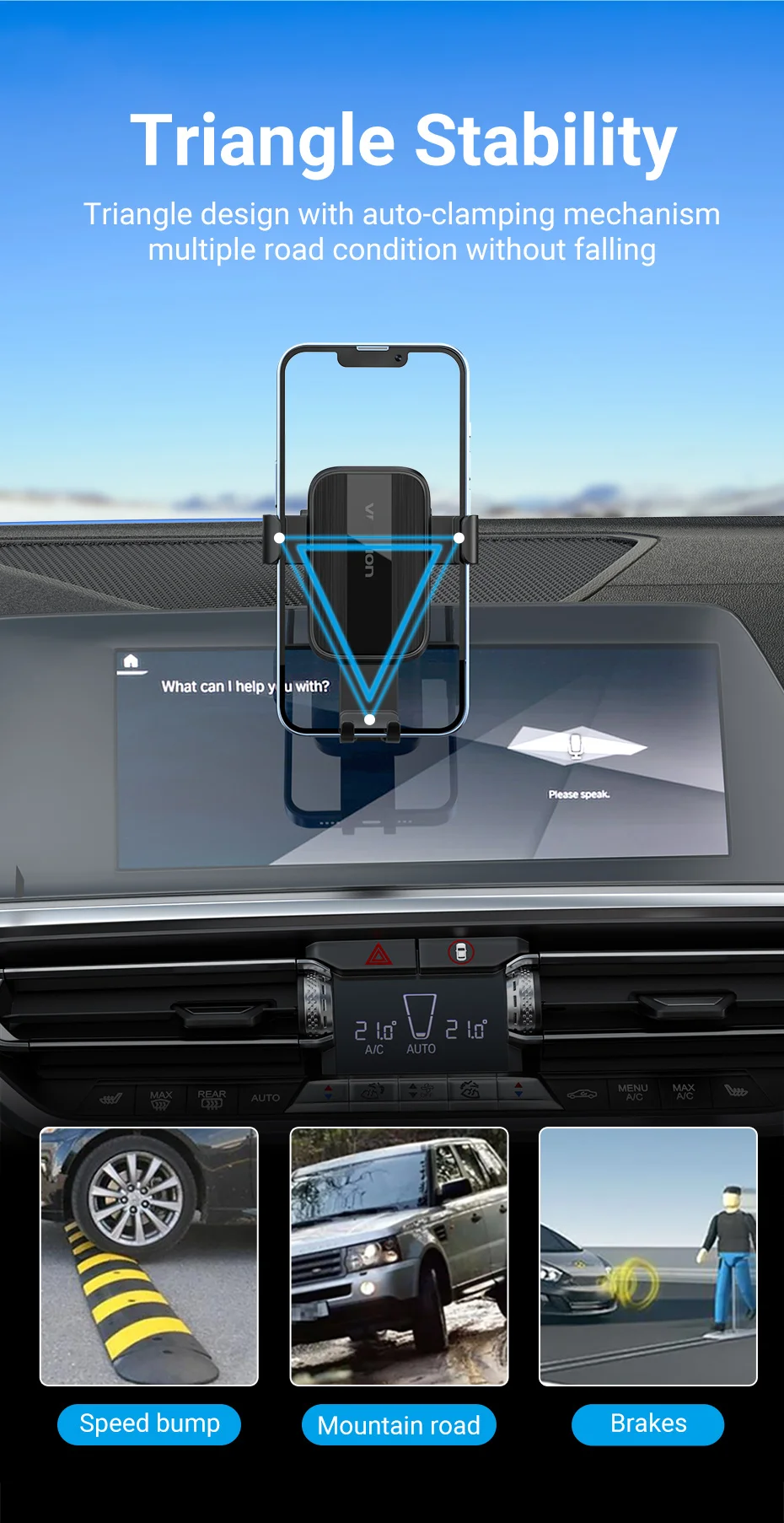 – Gravity-based clamping mechanism that automatically adjusts to fit various phone sizes securely.