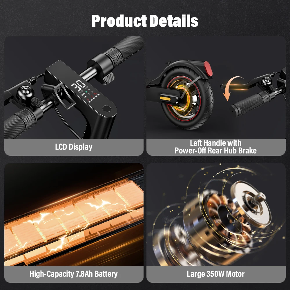 – 350 W rear-drive motor delivering strong acceleration and a top speed of up to 30 km/h