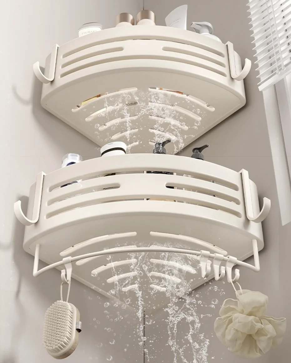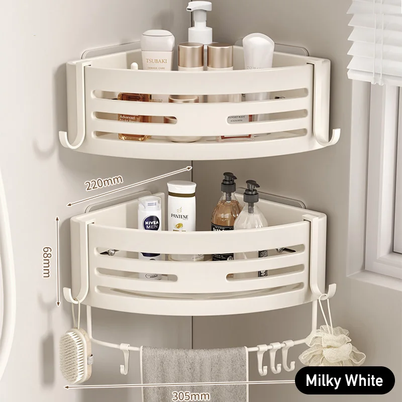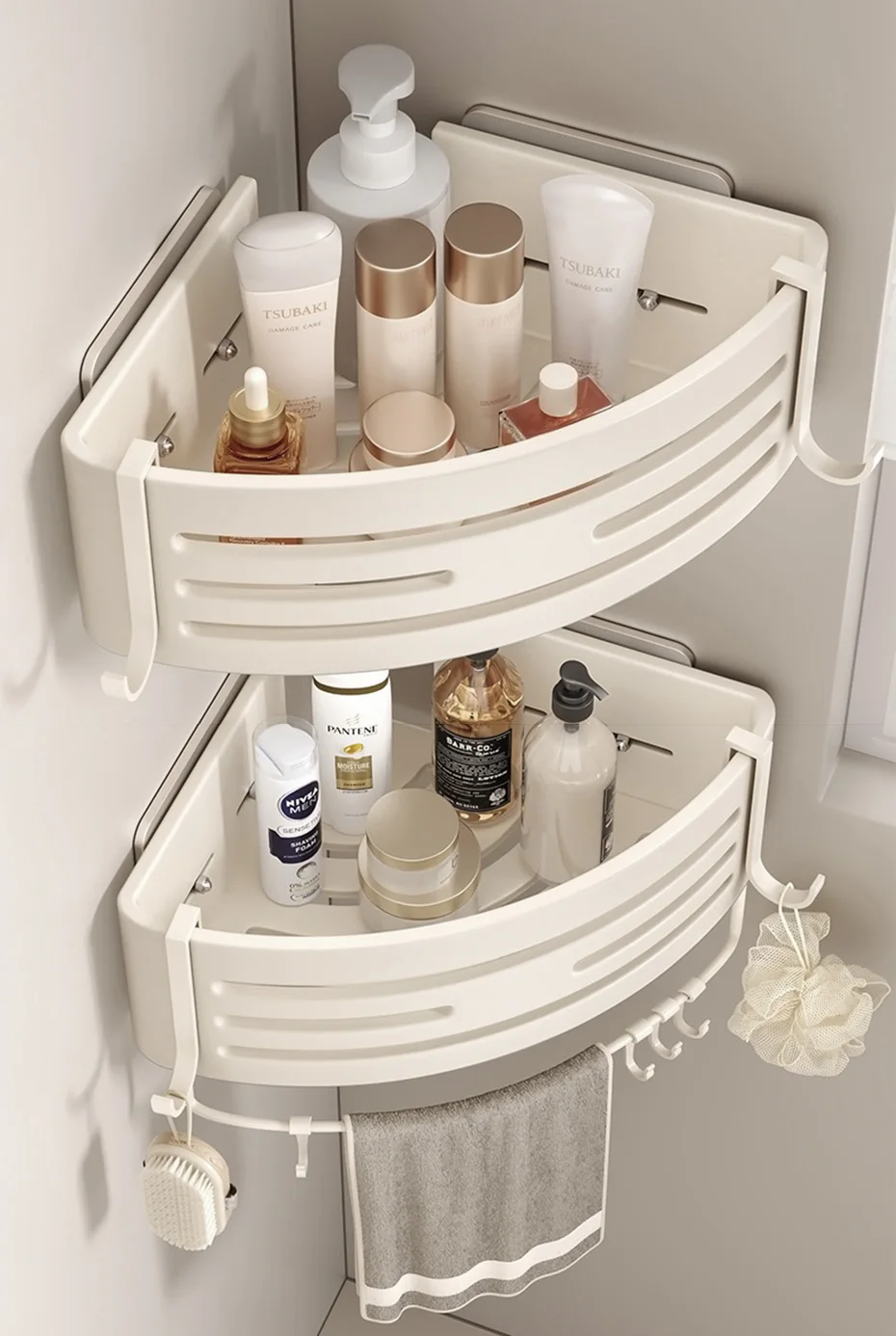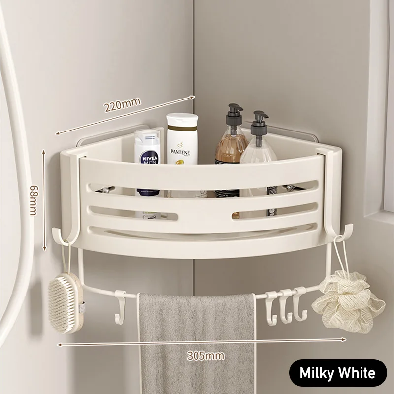 Imagine a bathroom where everything has its place. Our self-adhesive shelf organizer makes this a reality. Effortlessly store your shampoo bottles, conditioners, soaps, and lotions in the corner, keeping your shower area clutter-free and your essentials within easy reach. The integrated towel hook ensures your towel is always conveniently accessible after your shower or bath, promoting a more organized and hygienic environment. Its strong adhesive means you can trust it to hold your items securely, providing peace of mind.