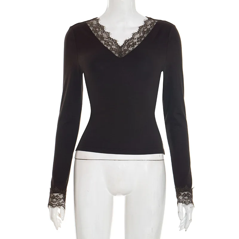 Women’s V-neck Lace Trim Splice Waist-cinching Belly-baring Top Trendy Street Style Long Sleeve Polyester Spandex T-shirt